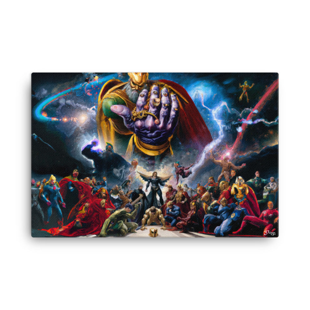 Canvas of a classical painting take on a movie poster for the Avenger: Endgame with Thanos holding the Infiniti Gauntlet and casting a shadows on the Avengers.